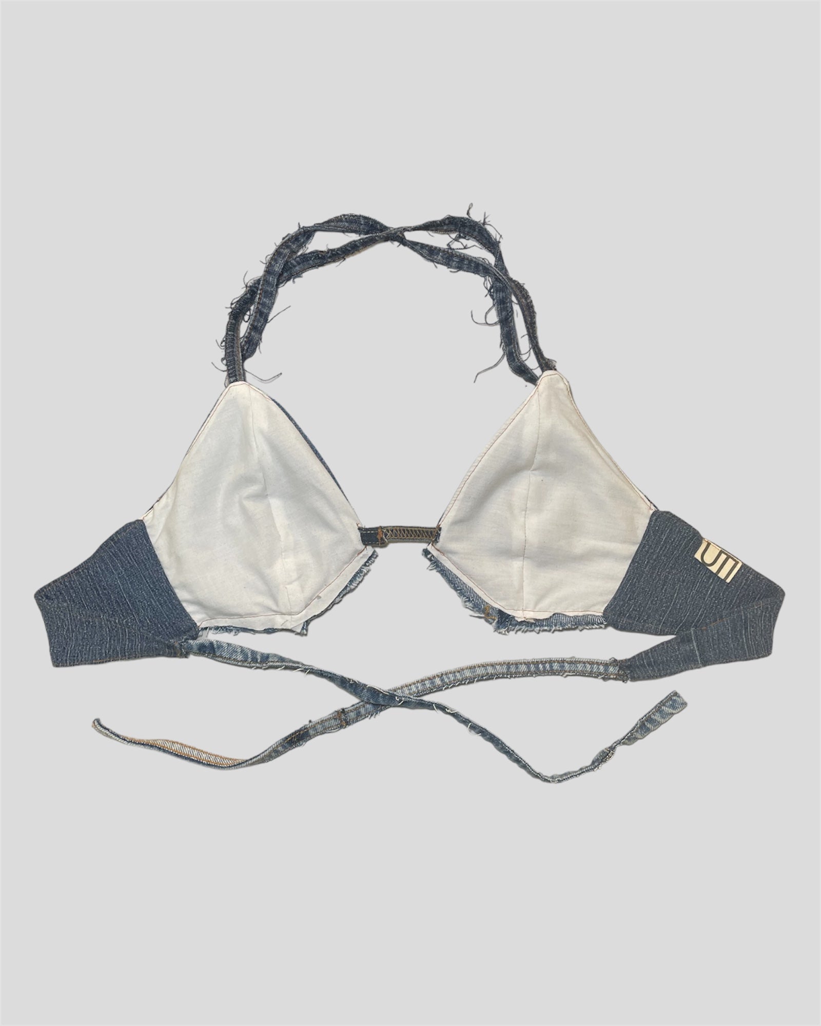 - Adjustable pockets top made from vintage jeans’ back pockets.
